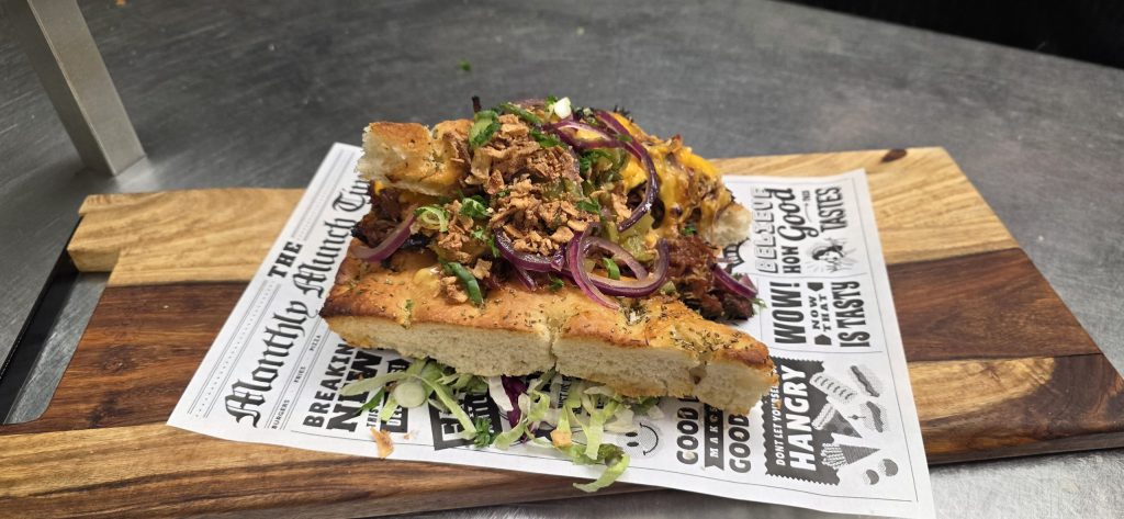 Pulled beef / focaccia / cheddar kaas / zoet-zure rode ui / augurk / gedroogde uitjes / gemengde sla